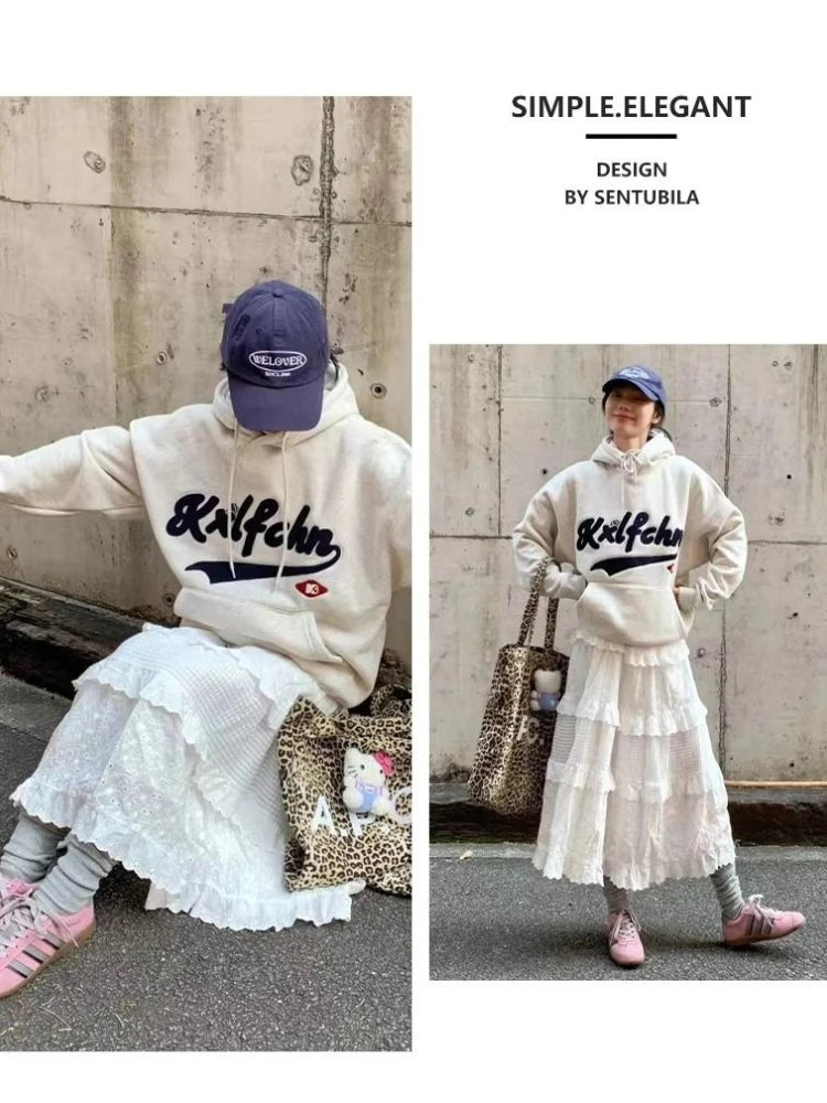 Spring Summer New Women Skirts Vintage High Waist Elastic Patchwork White Black Chic Long Cake A-line Skirt